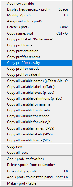 Il menu contestuale (pulsante destro) della lista delle variabili permette di copiare elementi utili per la scrittura dello script: nomi e etichette di variabili, bozze di comandi classify, recode, value_if, ecc.